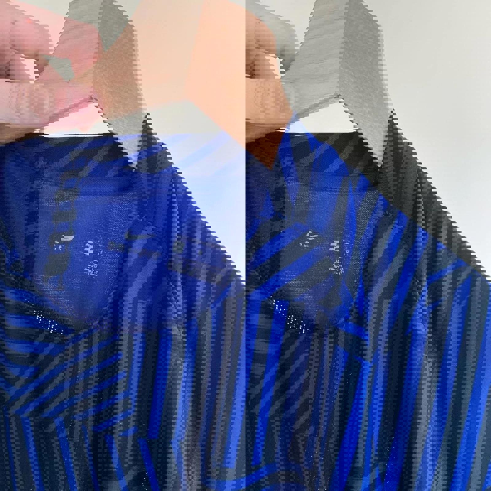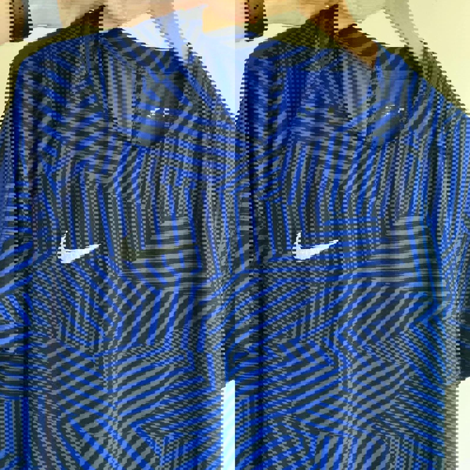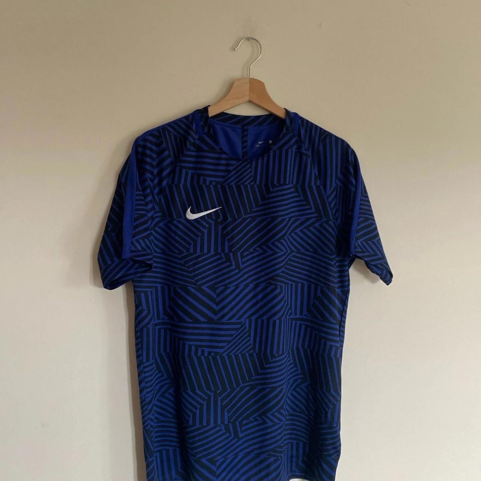Nike Dri Fit men’s large T-shirt in good overall condition, featuring a blue and black pattern.