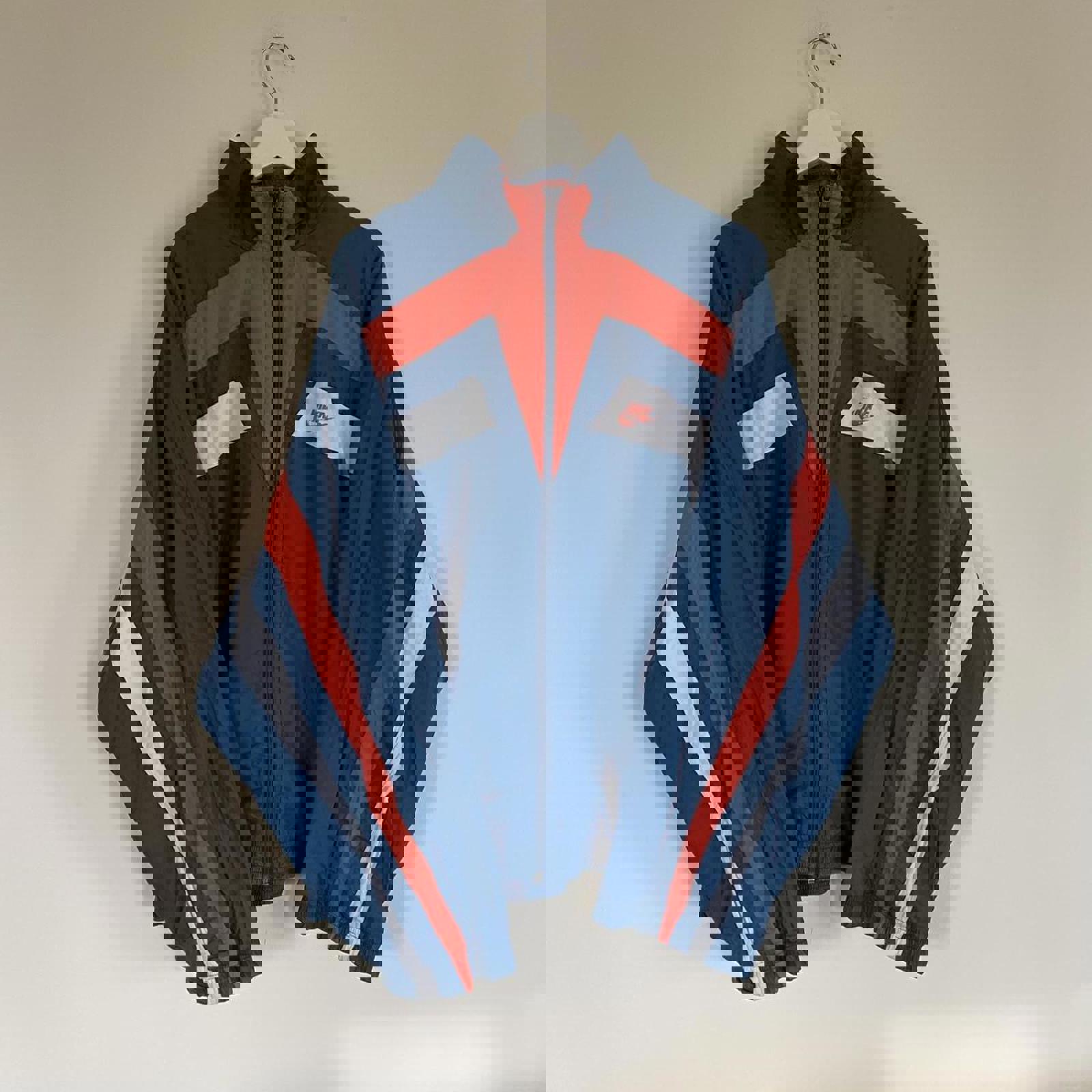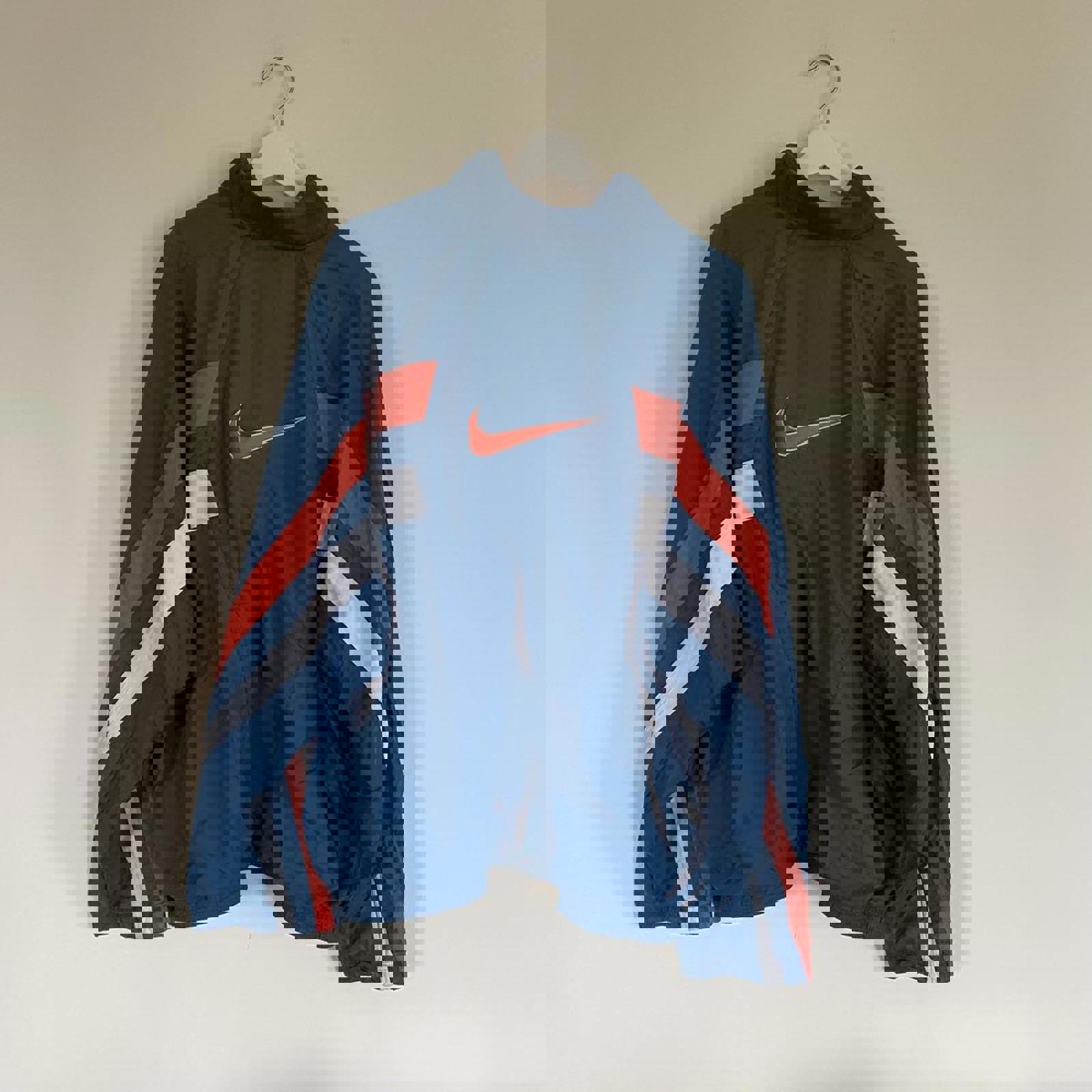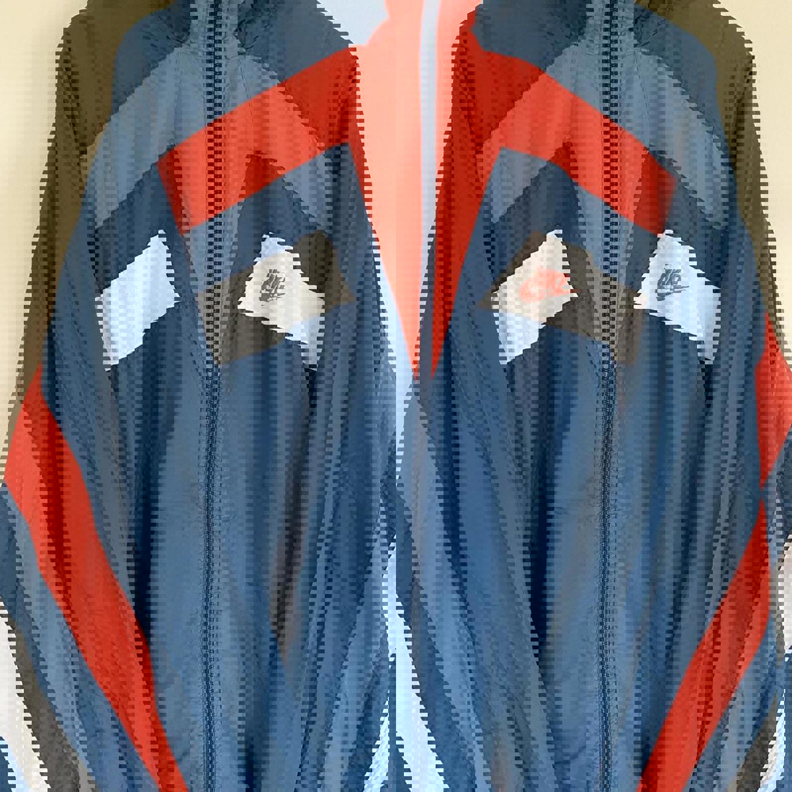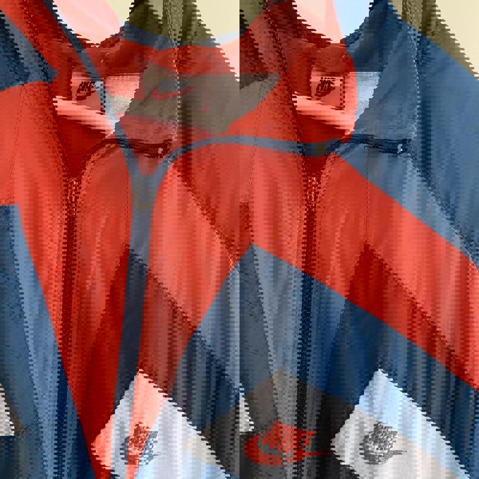 Vintage Nike Windbreaker in size large, suitable for XL. Great overall condition with no rips, holes, or stains. Some damage to the embroidered logo and the zip pull is missing. Retro Nike design.